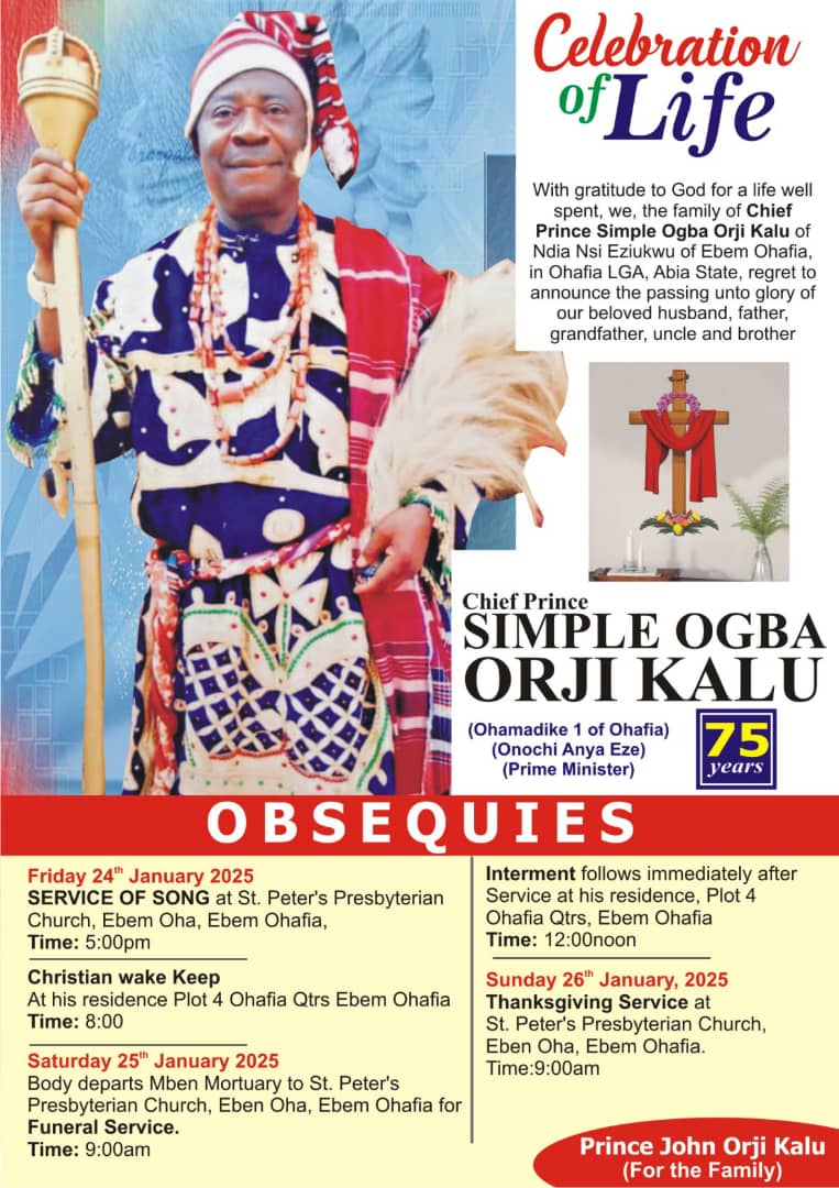 The ceremonies will conclude with a Thanksgiving Service on Sunday, January 26, 2025, at St. Peter’s Presbyterian Church, Ebem Oha, marking the end of a life well-lived and the beginning of a lasting legacy.