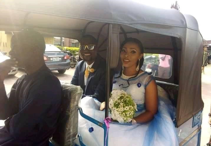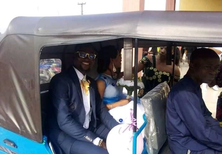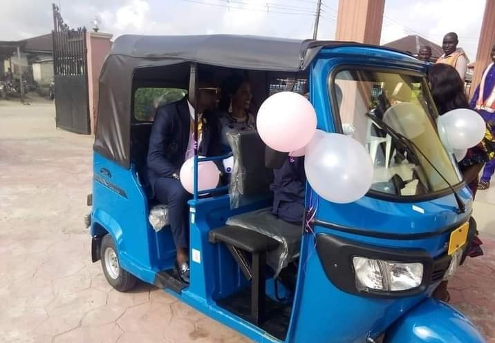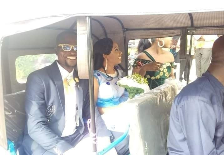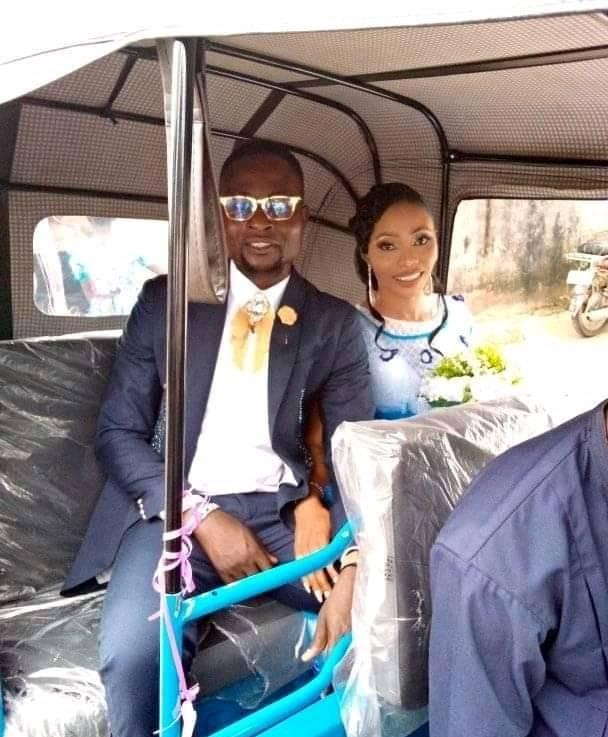 A Nigerian man who doubles as an entertainer and a journalist, Christian Eloho Usioyibo and his new wife, Comfort Religion arrived at the venue of their wedding in a tricycle popularly known as Keke Napep.