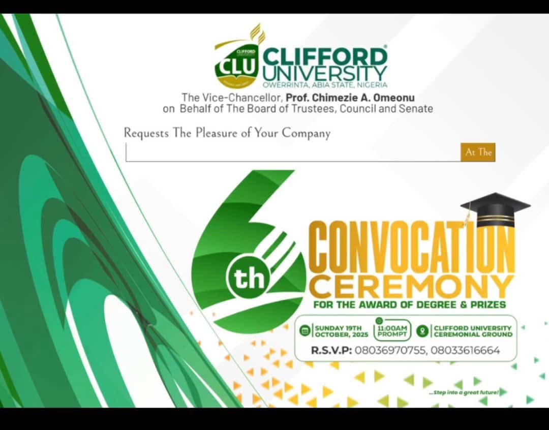 All eyes will be on Clifford University, Owerrinta, Abia State, this Sunday, October 19, 2025, as Nigeria’s Afrobeat sensation, Davido, takes center stage, not on a concert platform, but at the university’s 6th Convocation Ceremony.