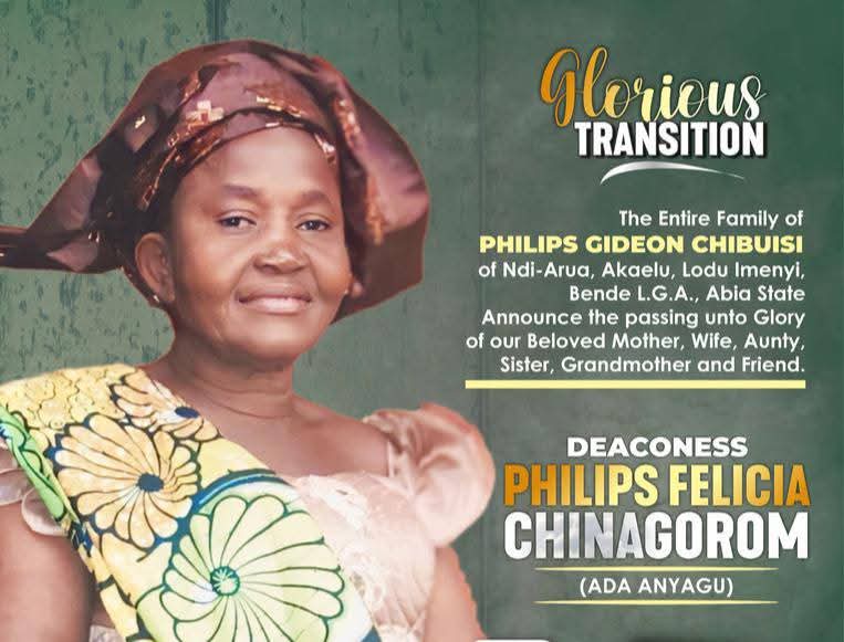 The entire family of Mr. Philips Gideon Chibuisi of Ndi-Arua, Akaelu, Lodu Imenyi, Bende Local Government Area of Abia State, has announced the passing unto glory of their beloved matriarch, Deaconess Philips Felicia Chinagorom (Ada Anyagu). She was aged 70.