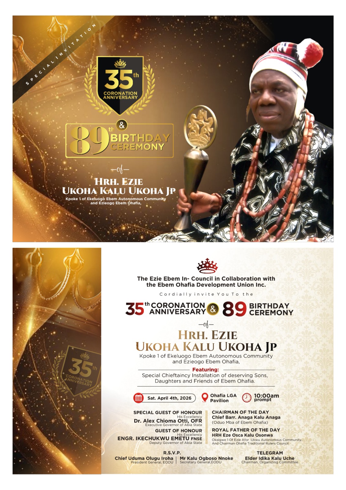 The Ebem Ohafia community in Abia State is set to host a grand celebration in honour of its Paramount Ruler, His Royal Highness Ezie Ukoha Kalu Ukoha (JP), as he marks his 35th Coronation Anniversary and 89th Birthday.
