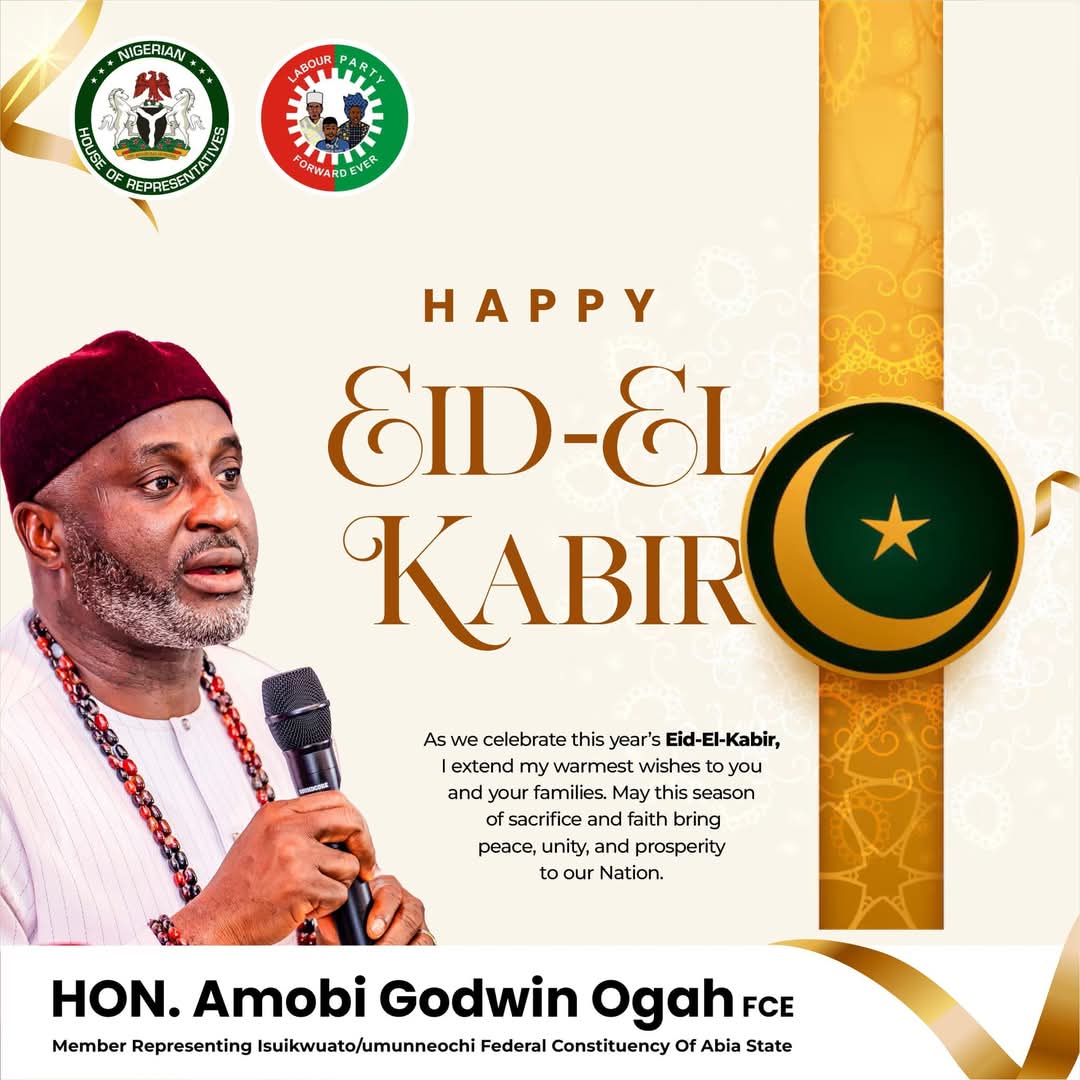 The lawmaker representing Isuikwuato/Umunneochi Federal Constituency in the House of Representatives, Hon. Amobi Godwin Ogah, has extended warm greetings to Muslim faithful across Nigeria as they celebrate the 2025 Eid-ul-Adha festival.