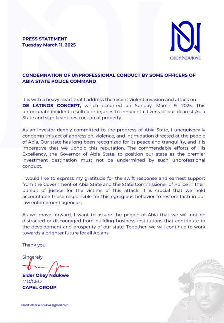 Elder Okey Ndukwe, the Managing Director and CEO of Capel Group, has strongly condemned the recent attack on De Latinos Concept by some officers of the Abia State Police Command.