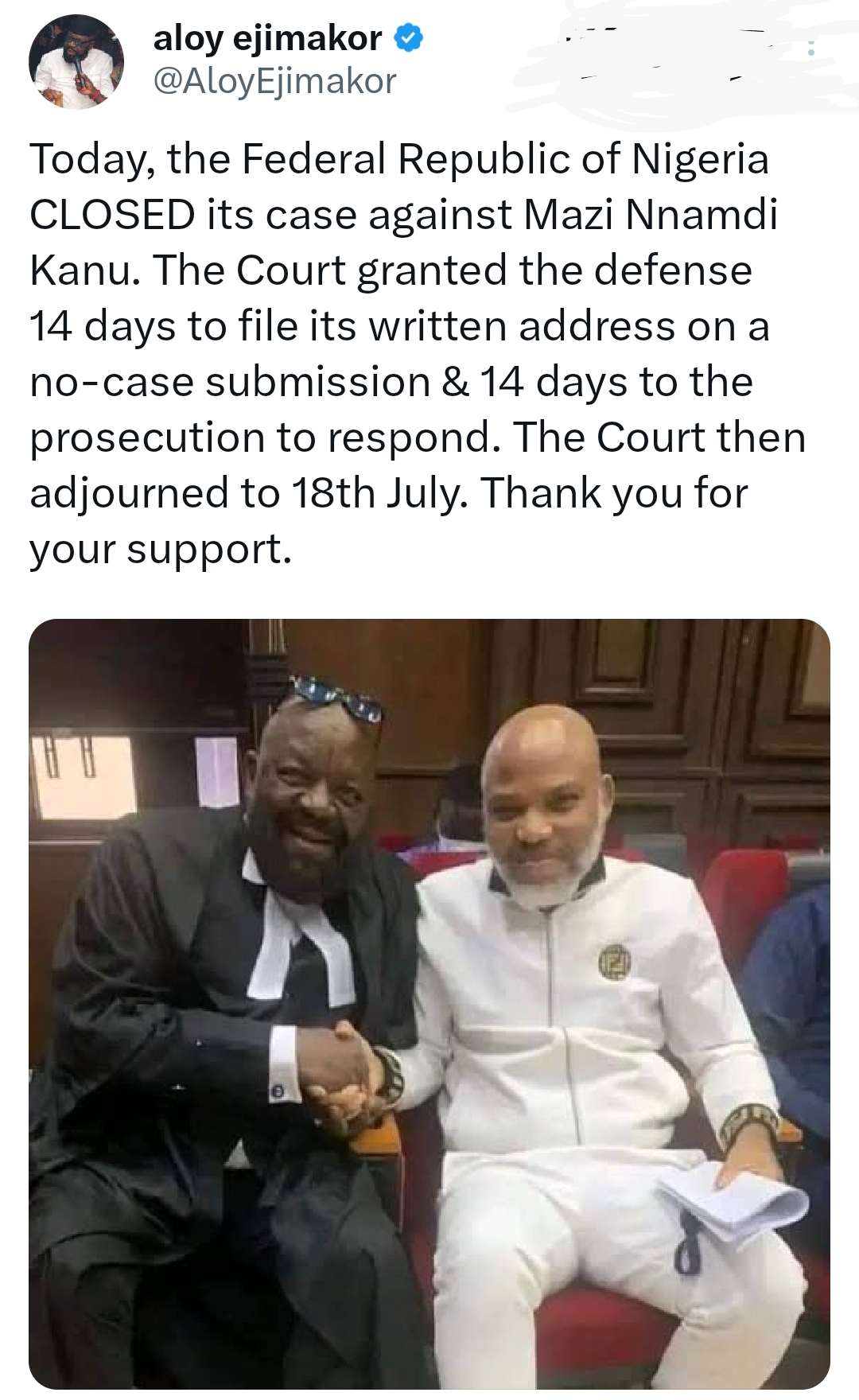 “Today, the Federal Republic of Nigeria CLOSED its case against Mazi Nnamdi Kanu… Thank you for your support,” Ejimakor posted.
