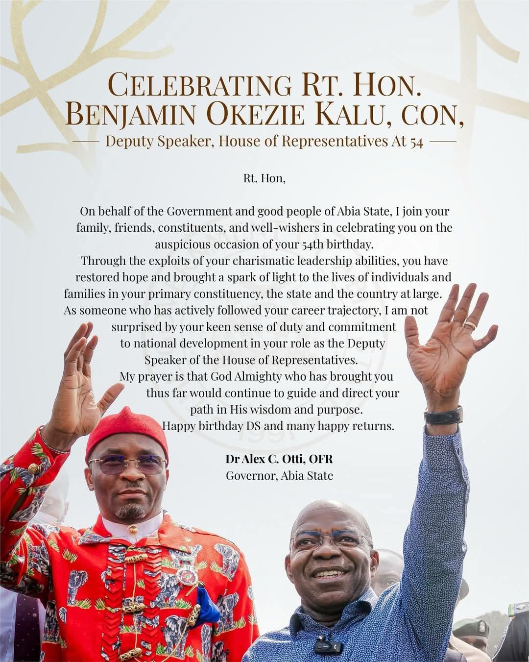Abia State Governor, Dr. Alex C. Otti, has extended warm felicitations to the Deputy Speaker of the House of Representatives, Rt. Hon. Benjamin Okezie Kalu, on the occasion of his 54th birthday.