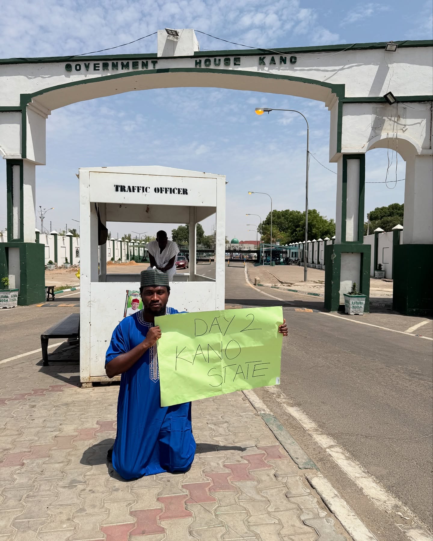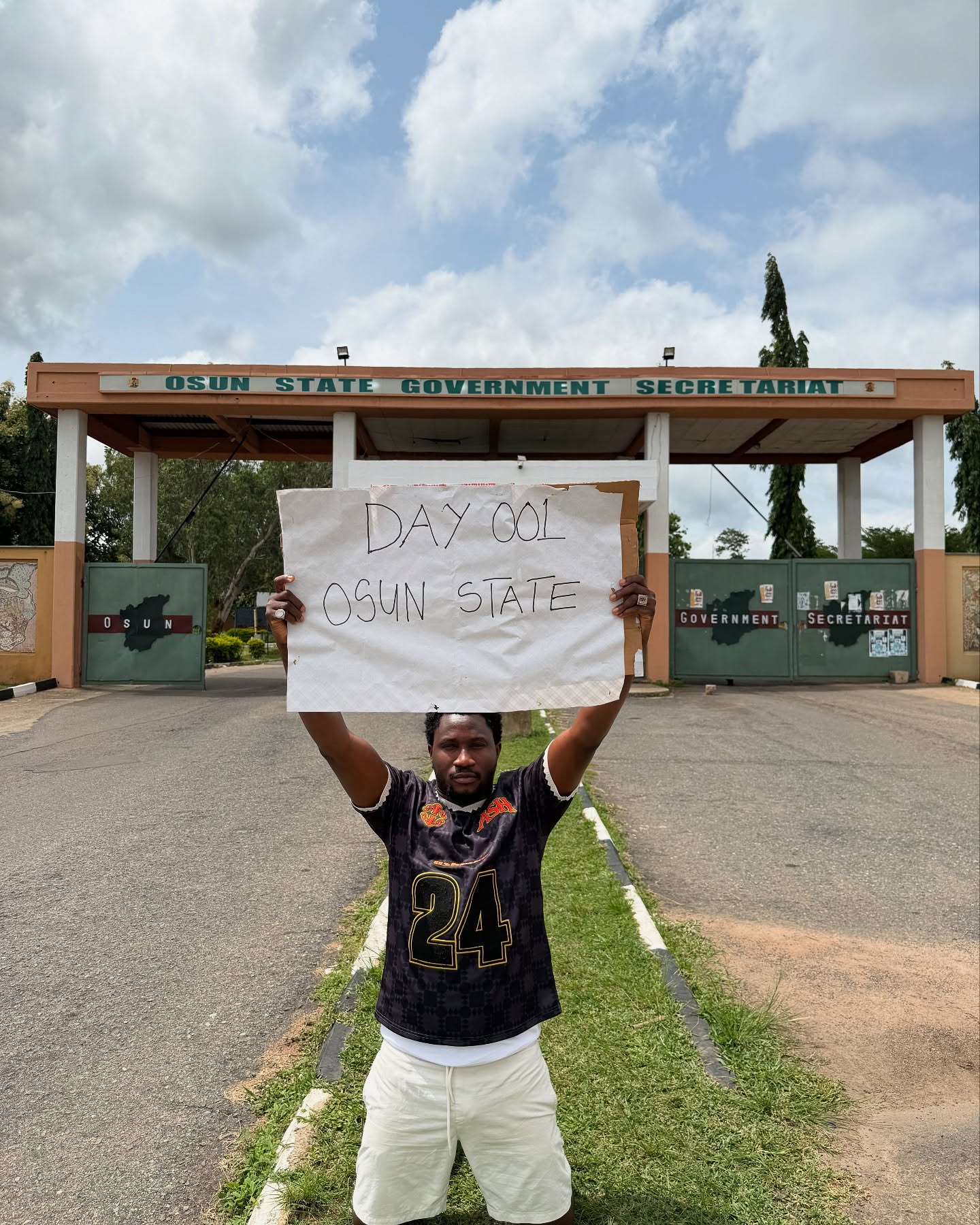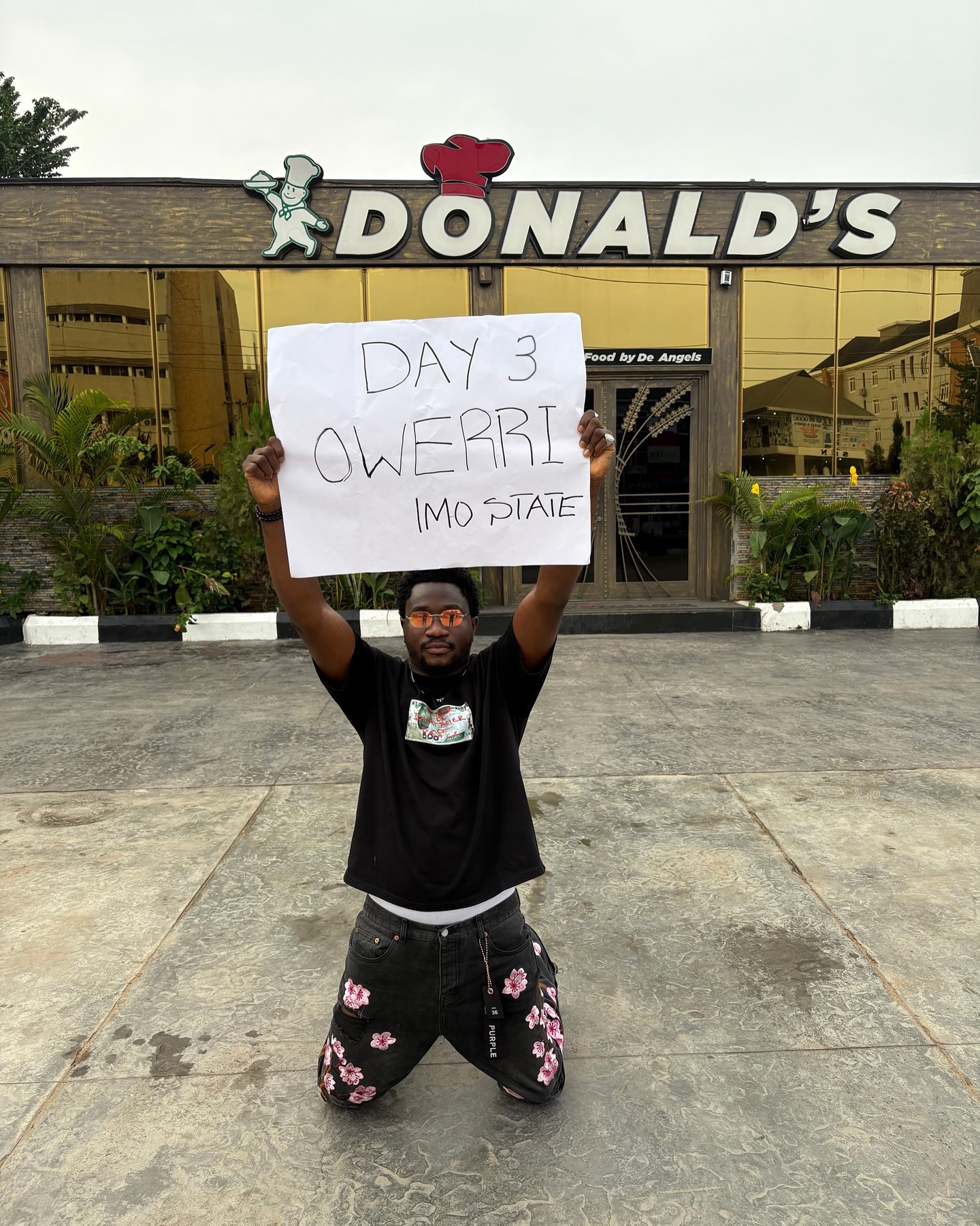 Nasboi announced the tour on Instagram with a picture of himself holding a placard in front of the Osun State Government Secretariat as the kickoff point. The next day, he was spotted kneeling at the Kano State Government House and was seen today at Donald’s Fast Food in Imo State.