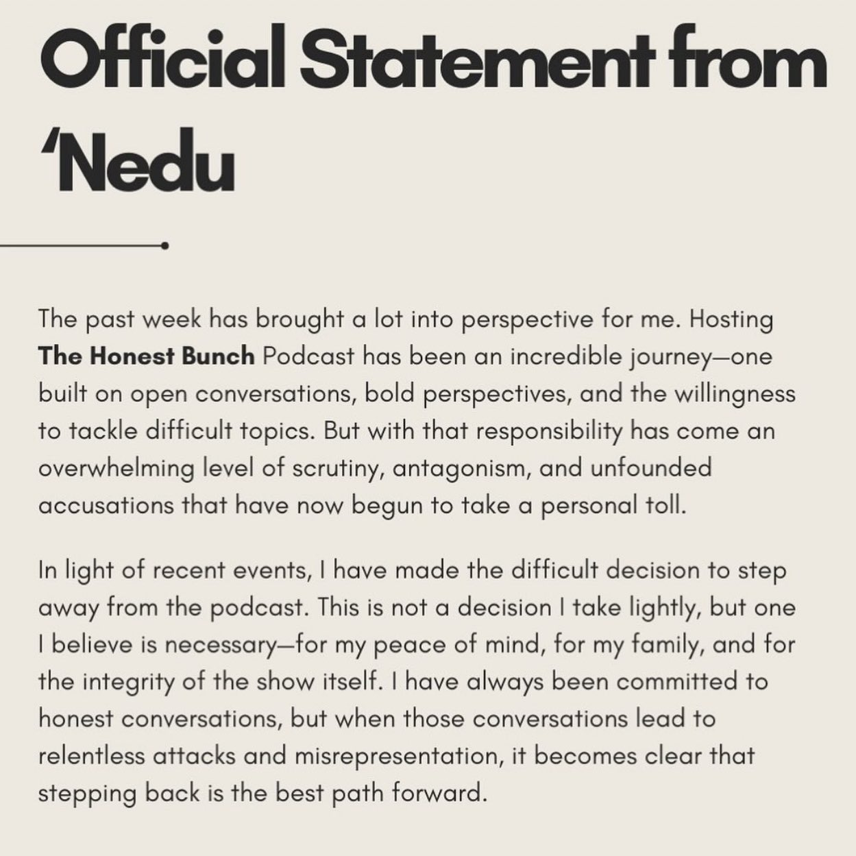 In his official statement, Nedu expressed appreciation for the journey and impact of The Honest Bunch Podcast but admitted that the mounting scrutiny, antagonism, and accusations had taken a personal toll.