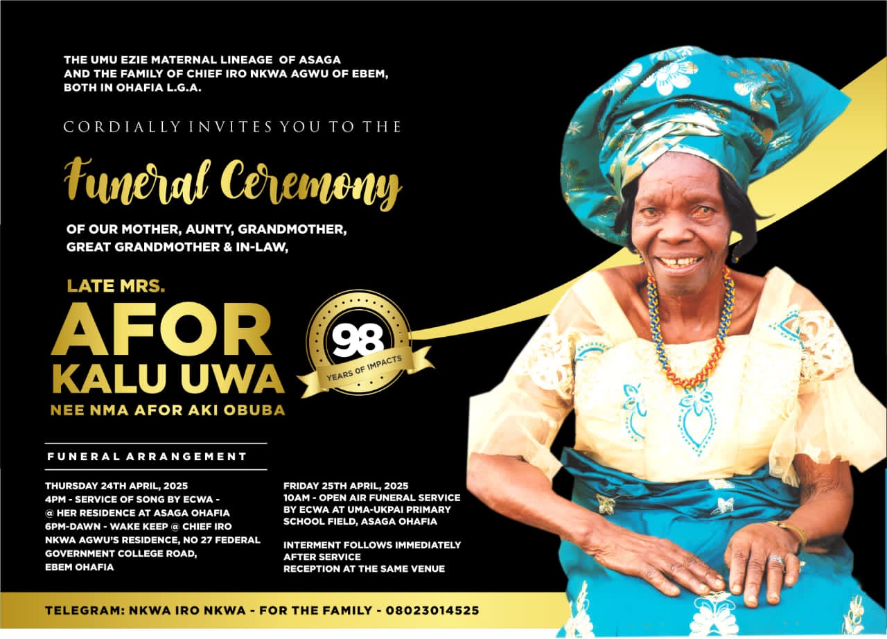 The Umu Ezie maternal lineage of Asaga and the family of Chief Iro Nkwo Agwu of Ebem, both in Ohafia Local Government Area of Abia State, have announced the funeral arrangements of their beloved matriarch, Late Mrs. Afor Kalu Uwa.