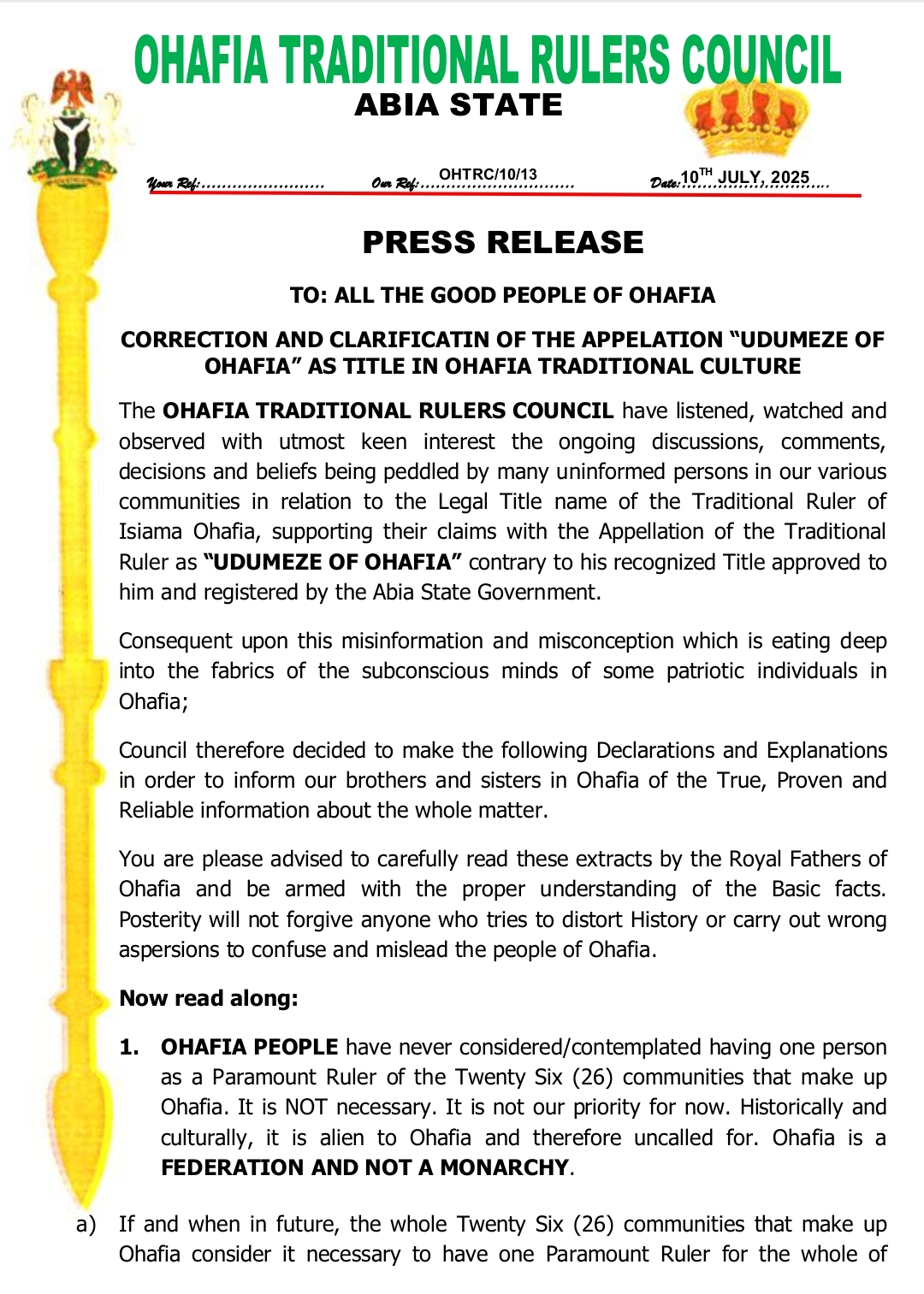 In a press statement jointly signed by the Chairman of the Council, HRH Eze U.K. Ukoha (JP), and the Secretary, HRH Eze Elder Dr. Ezera U. Ezera (JP) and made available to ABN TV, the royal fathers warned against ongoing attempts to promote the appellation “Udumeze of Ohafia” as an official or traditional title.