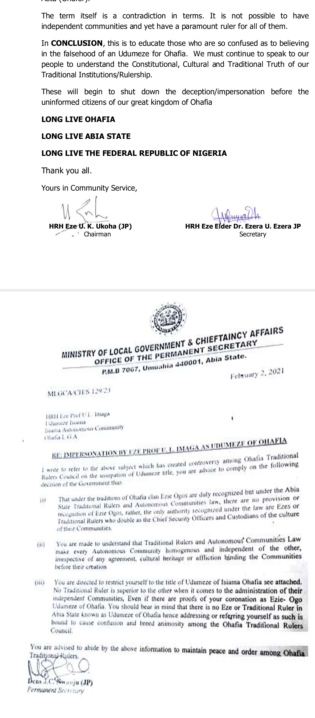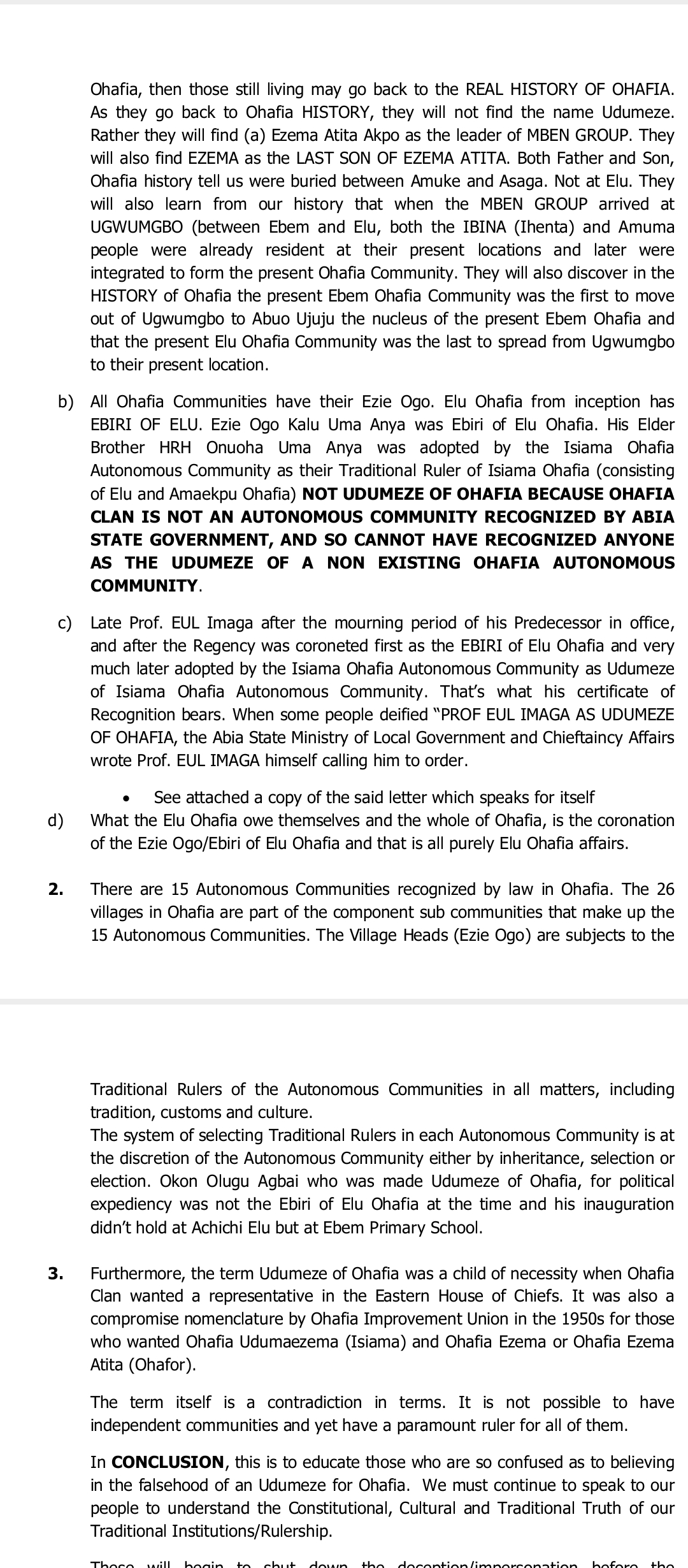 The release also recounted past attempts to wrongly elevate certain individuals to the status of a general Ohafia monarch, including the case of the late Prof. E.U.L. Imaga, who was cautioned by the Abia State Ministry of Local Government and Chieftaincy Affairs for being referred to as “Udumeze of Ohafia.” His official certificate of recognition confirmed him only as the traditional ruler of Isiama Ohafia.