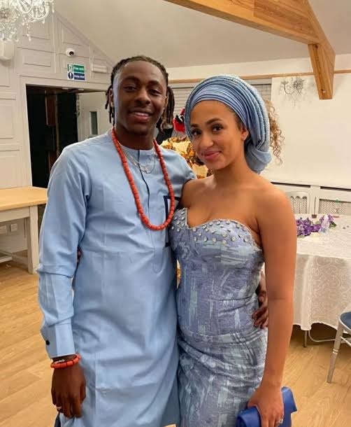 The 26-year-old, who represents England internationally, was spotted wearing the traditional attire, Isiagu, which is synonymous with the South Eastern Nigeria dress culture for elite events in what was an Igbo-themed wedding.