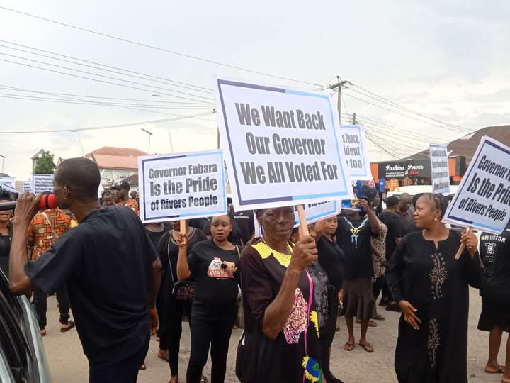 Clad in black and carrying placards with inscriptions such as “Together we stand for Governor Sim Fubara,” “We want back our Governor; we all voted for” Governor Fubara; he is the pride of Rivers people,” the protesters kicked off the march from Aggrey Road, Old Port Harcourt Township.