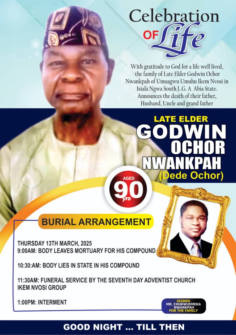 The family of Late Elder Godwin Ochor Nwankpah has announced the final journey of their beloved patriarch, whose life was marked by faith, leadership, and service. Elder Nwankpah, fondly called “Dede Ochor,” passed away on December 7, 2024, at the age of 90.