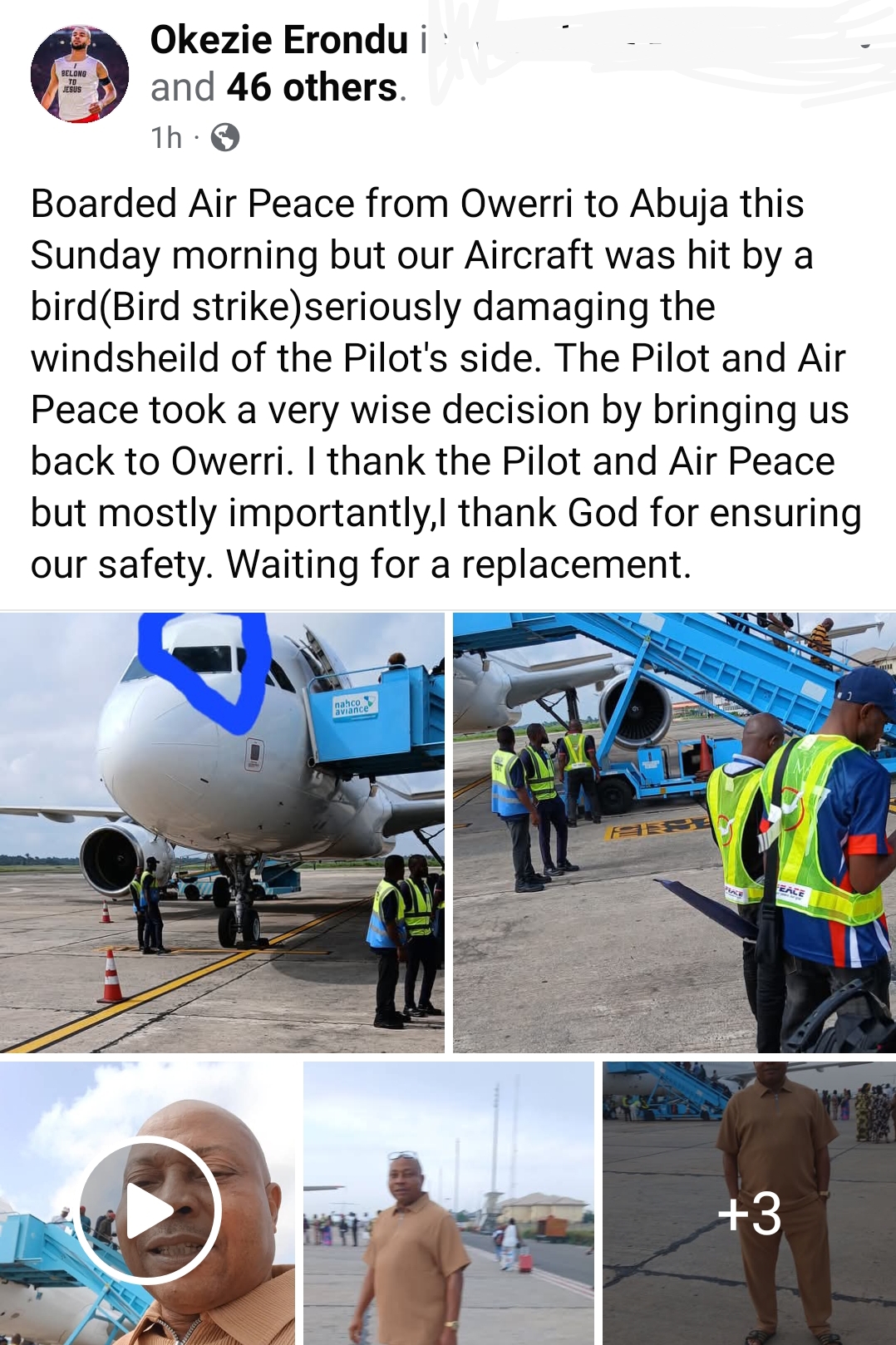 “Boarded Air Peace from Owerri to Abuja this Sunday morning but our aircraft was hit by a bird (bird strike), seriously damaging the windshield of the pilot’s side. The pilot and Air Peace took a very wise decision by bringing us back to Owerri. I thank the pilot and Air Peace, but most importantly, I thank God for ensuring our safety. Waiting for a replacement,” he wrote.