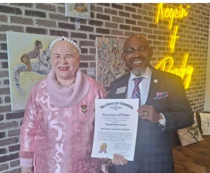 The honorary certificate, signed by Georgia’s Secretary of State, Brad Raffensperger, and dated January 16, 2026, describes Kanu as an “Outstanding Citizen” and a “Goodwill Ambassador” from the State of Georgia to the rest of the world.